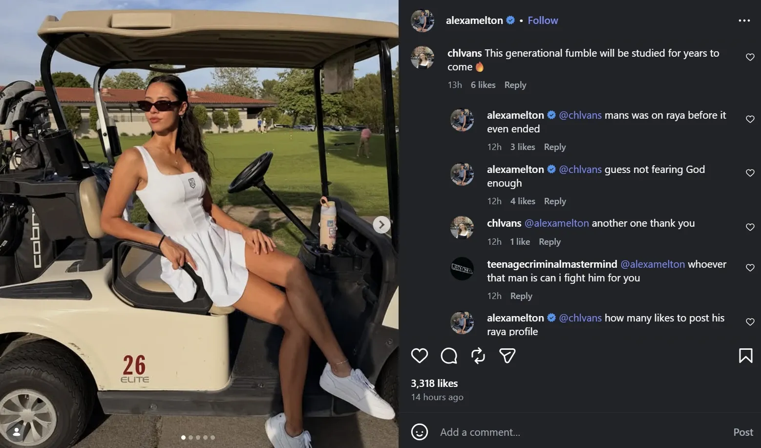 There's an innate belief, I think, that Melton's comment that "mans [Pulisic] was on Raya before it even ended" means we have the right to cast Pulisic as the villain without knowing any other detail of the breakup (which, of course, we have no right to know). Pulisic was clearly looking to cheat because Alexa told us as much, right? No reason to interrogate the trustworthiness of her one-off comment on an Instagram post. Dive right in and drag the man.